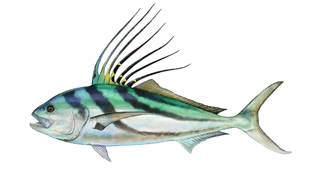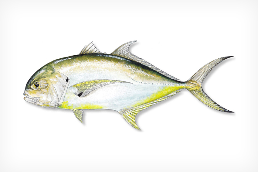 description: Deep, laterally compressed body with a powerful build. Large head and strong jaw, blunt snout. Dark olive to blue-green dorsally with silvery sides and belly. Prominent black spot on the operculum (gill cover) and another at the base of the pectoral fin. Dorsal and caudal fins often dark, with the caudal fin deeply forked. Highly active predator known for its aggressive strikes and strong fighting ability. | ||