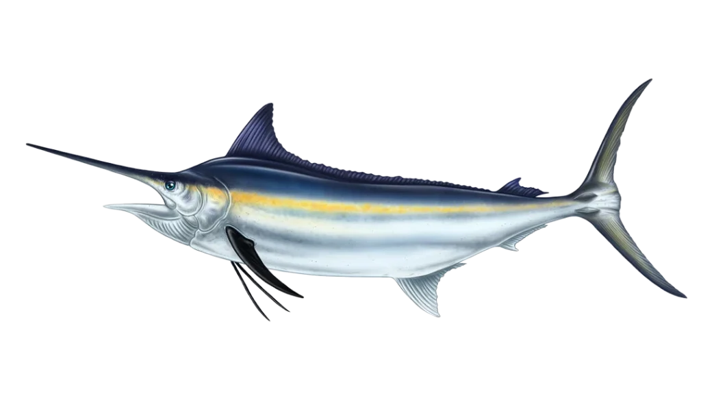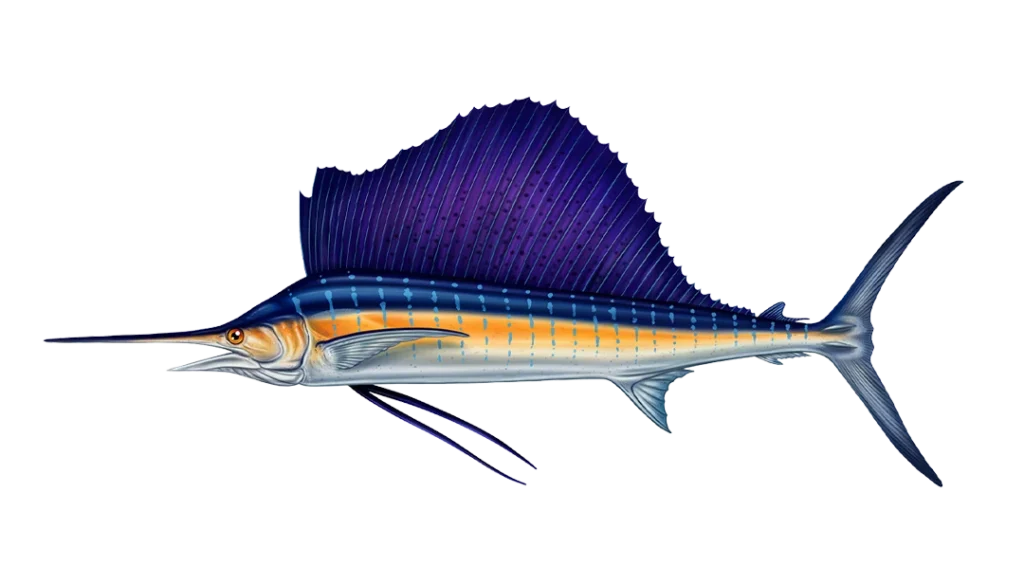 description: Long body compressed on the sides. Very long bill. Sail-like dorsal fin with dark spots.