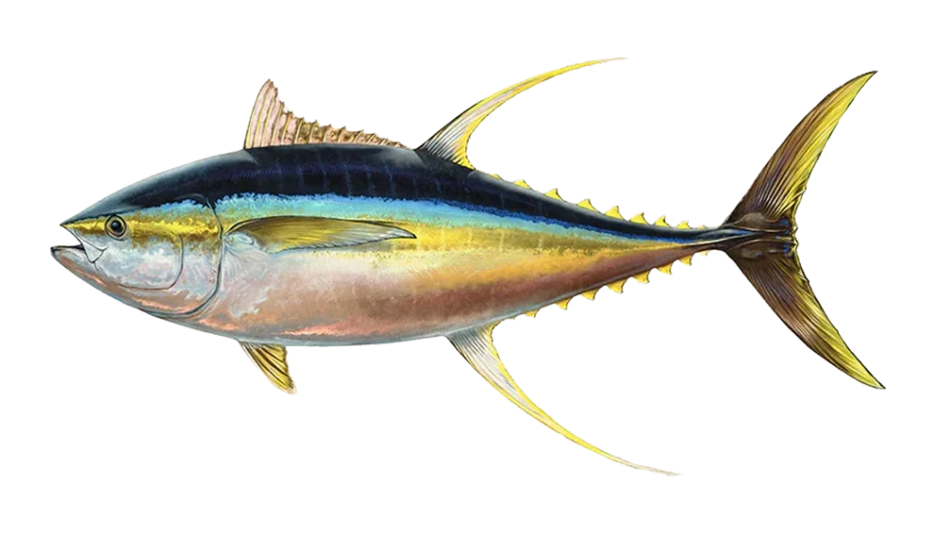 Dorsal and anal finlets are bright yellow with narrow black edges. Second dorsal fin and